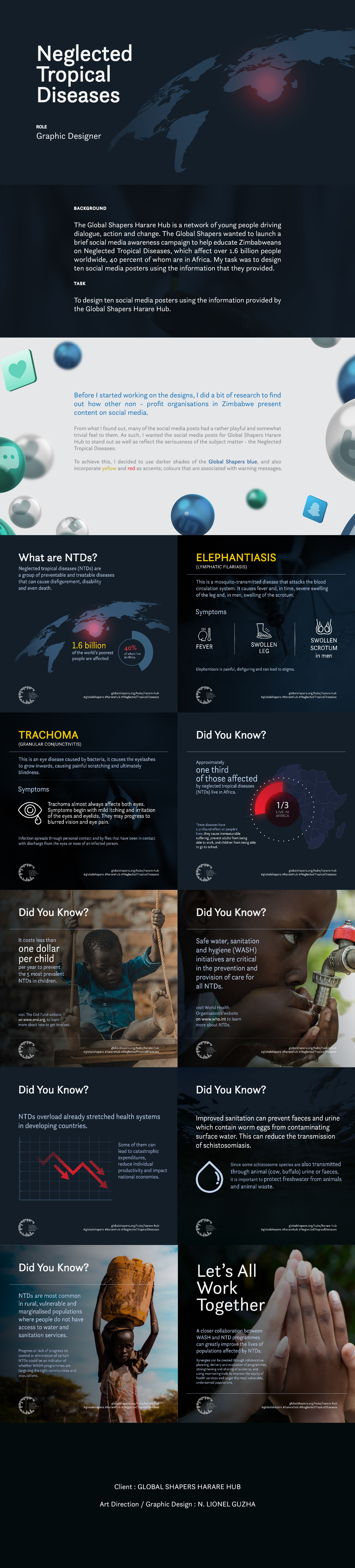 The Global Shapers Harare Hub is a network of young people driving dialogue, action and change. The Global Shapers wanted to launch a brief social media awareness campaign to help educate Zimbabweans on Neglected Tropical Diseases, which affect over 1.6 billion people worldwide, 40 percent of whom are in Africa. My task was to design ten social media posters using the information that they provided. The job was to design ten social media posters using the information provided by the Global Shapers Harare Hub.