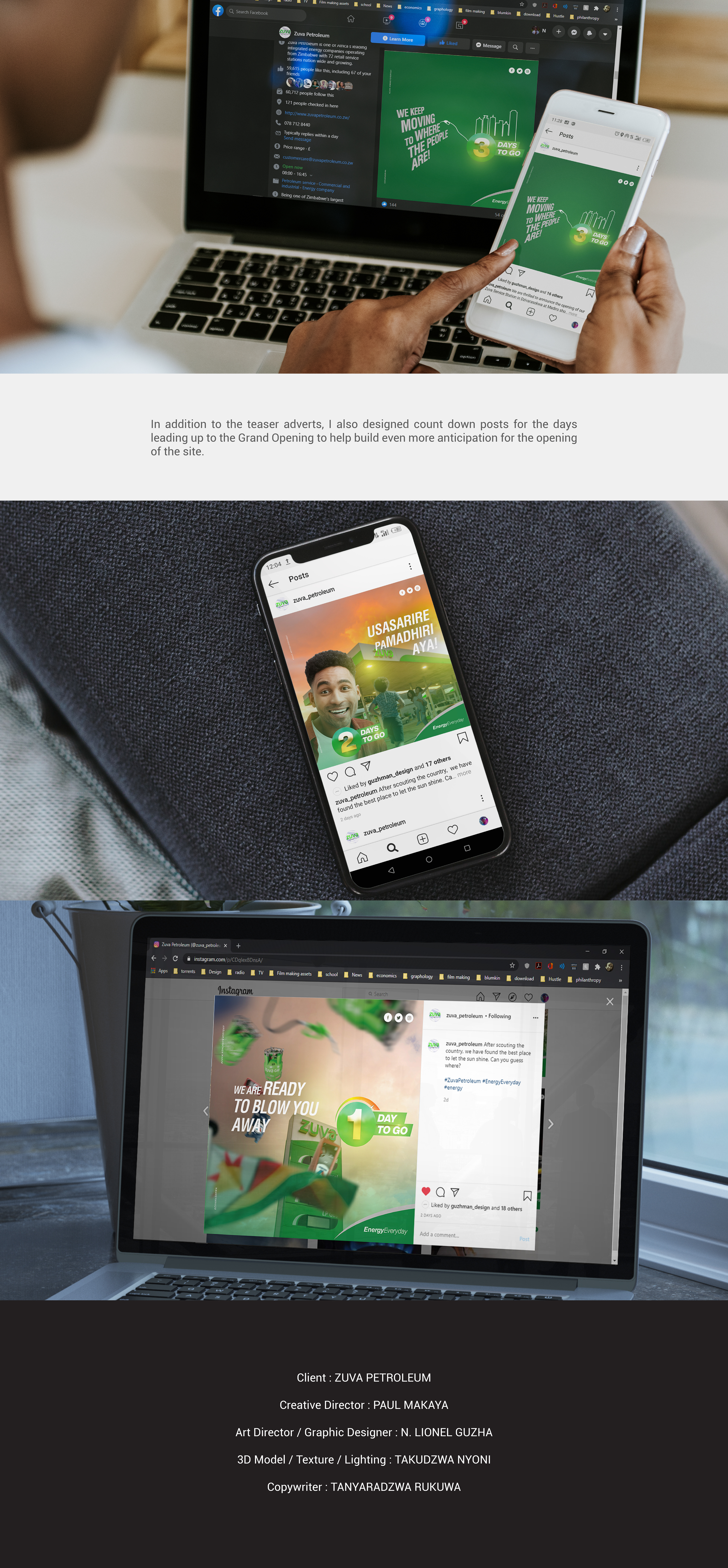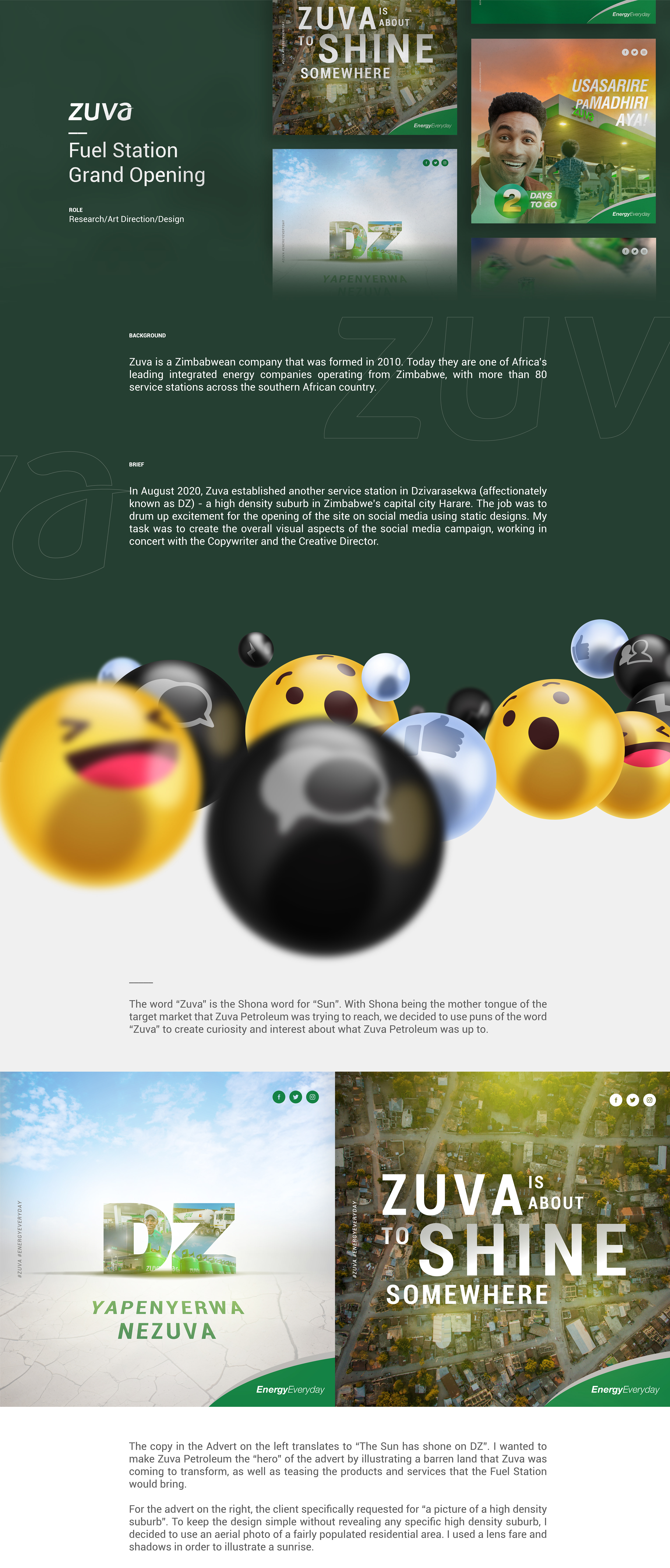 Zuva Petroleum is a Zimbabwean company that was formed in 2010. Today they are one of Africa’s leading integrated energy companies operating from Zimbabwe with more than 80 service stations across the southern African country. Through their franchising initiative, Zuva continues to grow having established a service station in August 2020 in Dzivarasekwa in Harare. The job was to drum up excitement for the opening of the site on social media. As the Creative Director had already worked out with the client on the general creative direction, my task was to create the overall visual aspects of the social media campaign, working in concert with the Copywriter and the Creative Director.